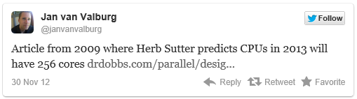 First, let’s look at the lower baseline, ‘most general mainstream users to have [4-16 way parallelism] machines in 2013’? So where are were in 2012 today for mainstream CPU hardware parallelism? Well, Intel Core i7 (e.g., Sandy Bridge, Ivy Bridge) are typically in the 4 to 6 core range – which, with hyperthreading == hardware threads, means 8 to 12 hardware threads.